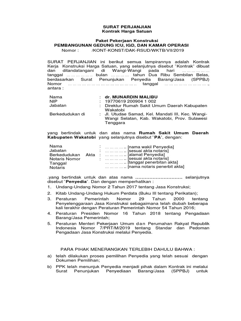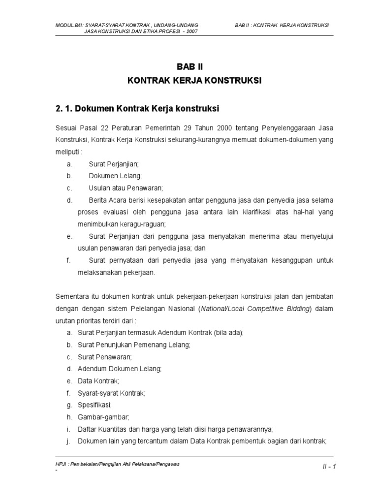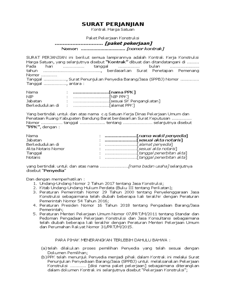 Draft Kontrak Pekerjaan Konstruksi Sesuai Permen Pupr No 7 Tahun 2019 Versi Ms Word Pengadaan Eprocurement from 4.bp.blogspot.com Kontrak ini berarti bahwa pemilik rumah memberikan kuasa sepenuhnya kepada kontraktor untuk mengatur dan melaksanakan seluruh pekerjaan, mulai dari tahap persiapan pekerjaan, penyediaan tenaga kerja, penyediaan material bangunan, sampai serah terima pekerlaan oleh kontraktor. Jenis kontrak kerja konstruksi di indonesia terdapat Pengaturan hukum kontrak kerja proyek konstruksi kontrak proyek konstruksi termasuk perjanjian untuk melakukan pekerjaan (kuhp pasal 1601 b) isinya diatur oleh: Pemutusan kontrak kerja konstruksi, yang memuat ketentuan tentang pemutusan kontrak kerja konstruksi yang timbul akibat tidak dapat dipenuhinya kewajiban salah satu pihak. Bentuk kontrak proyek konstruksi tertulis, mengandung resiko tinggi menyangkut keselamatan umum dan tertib bangunan. Berkaitan dengan hal tersebut, anda perlu mencari dan memahami contoh kontrak kerja karyawan. Jika salah satu pihak tidak menyelesaikan kewajiban, terbuka peluang pemutusan kontrak secara sepihak. Hal ini berkaitan dengan sifat proyek yang memiliki batasan waktu dalam pengerjaannya.
