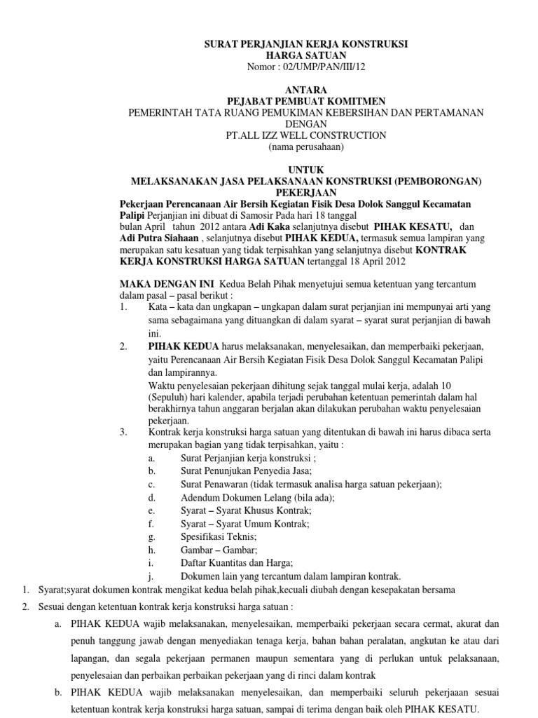 Adalah kontrak pengadaan barang/jasa atas penyelesaian seluruh pekerjaan. Definisi kontrak konstruksi adalah dokumen yang mempunyai kekuatan hukum yang memuat persetujuan bersama secara sukarela antara pihak kesatu dan pihak kedua. Biasanya, kontrak kerja tersebut berlaku untuk waktu tertentu maupun waktu tidak tertentu. Volume kontrak 1.000 m3, bila diukur ulang 1100 m3 æ yang dibayar tetap 1000 m3. Kontrak kerja konstruksi sebagaimana dimaksud pada ayat (1) tunduk pada hukum yang berlaku di indonesia. Keseluruhan dokumen yang mengatur hubungan hukum antara pengguna jasa dan penyedia jasa dalam. Berkaitan dengan hal tersebut, anda perlu mencari dan memahami contoh kontrak kerja karyawan. Pemutusan kontrak kerja konstruksi, yang memuat ketentuan tentang pemutusan kontrak kerja konstruksi yang timbul akibat tidak dapat dipenuhinya kewajiban salah satu pihak. Sehingga anda perlu memerhatikannya dengan teliti mengenai kontrak kerja karyawan yang ingin anda buat. Jenis kontrak kerja konstruksi di indonesia terdapat Dalam kontrak kerja konstruksi pada umumnya merupakan kontrak bersyarat yang meliputi: Syarat kelengkapan, merupakan syarat yang harus dilengkapi oleh satu atau. Adnan kusuma putra m faiz fadhilah sunday, july 19, 2015 1 evaluasi kontrak kerja manajemen konstruksi makalah uts 2.